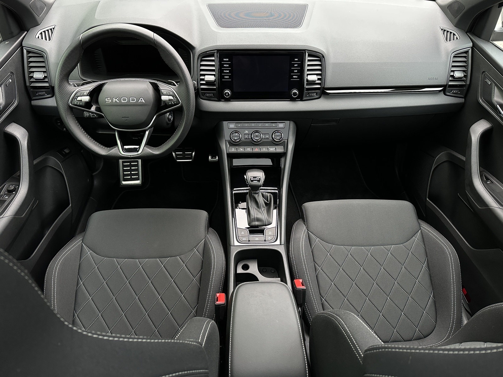 130/10712 Škoda Karoq Sportline 2.0TSi 4x4 DSG 140kW/190PS, Pohon všech kol 4x4, 7st. Automatická převodovka DSG, Šedá Steel, Tovární záruka Škoda Auto 03/2030 nebo 100.000km, Výbava vozu: Paket Drive PLUS - (Adaptivní podvozek DCC, Progresivní řízení, Hliníkové kryty pedálů, Volba jízních režimů + Off Road funkce), Nezávislé topení s dálkovým ovládáním - Webasto, Tažné zařízení sklopné - el. odjistitelné, Panoramatické střešní okno, Kola z lehkých slitin ALU Škoda "SAGITARIUS" 8Jx19" antracitová/leštěná, 230V zásuvka a nabíjecí USB-C port pro cestující vzadu, Paket Asistovaná jízda 2.0 – (Prediktivní tempomat – ACC, Asistent rozpoznávání dopravních značek, Adaptivní asistent pro udržování v jízdním pruhu – Lane Assist+, Asistent pro sledování mrtvého úhlu – Side Assist, Automatické parkování), Asistent rozjezdu do kopce, Volba jízdního režimu, 12V zásuvka v zavazadlovém prostoru, Asistent únavy řidiče, Bezdrátový SmartLink, Infotainment s Navigací 8", DAB – Digitální příjem rádia, Dvouzónová automatická klimatizace – Climatronic, Vnější zpětná zrcátka elektricky nastavitelná, sklopná, vyhřívaná, Hlasové ovládání, Digitální asistentka Laura, Jumbo box s loketní opěrkou, Kontrola tlaku v pneumatikách, Systém nouzového volání SOS – eCall+, 8x airbag, Výškově nastavitelná přední sedadla s bederní opěrkou, Elektrické ovládání předních a zadních oken, Sunset - zatmavená zadní skla, Světelný a dešťový senzor, USB-C vpředu, Ambientní LED osvětlení interiéru, KESSY – bezklíčové zamykání a startování, Nouzový asistent, Matrix-LED hlavní světlomety, Ostřikovače předních světlometů, Top-LED zadní světla s animovanými směrovými světly, Přední sportovní sedadla, Vyhřívaná přední a zadní sedadla, Potah sedadel – látka, Střešní nosič – lesklá černá, Vyhřívané trysky ostřikovačů čelního skla, Panoramatický kamerový systém 360°, Parkovací senzory přední a zadní – PDC, Virtuální pedál - komfortní elektrické otvírání zavazadlového prostoru, Vyhřívané čelní sklo, Virtual Cockpit 10", USB-C pro vnitřní zrcátko, Soundsystém CANTON – 10 reproduktorů + Digitální ekvalizér, Vyhřívaný kožený sportovní multifunkční volant s pádly řazení pro DSG, Sportovní kryty pedálů, Černě lakované doplňky karoserie, Dekorativní prahy dveří, Exteriér Sportline, Ocelové rezervní kolo, Zánovní vůz, Servisní kniha + kompletní dokumentace Škoda Auto, Možnost odpočtu DPH 21%, Skladem - ihned k odběru.