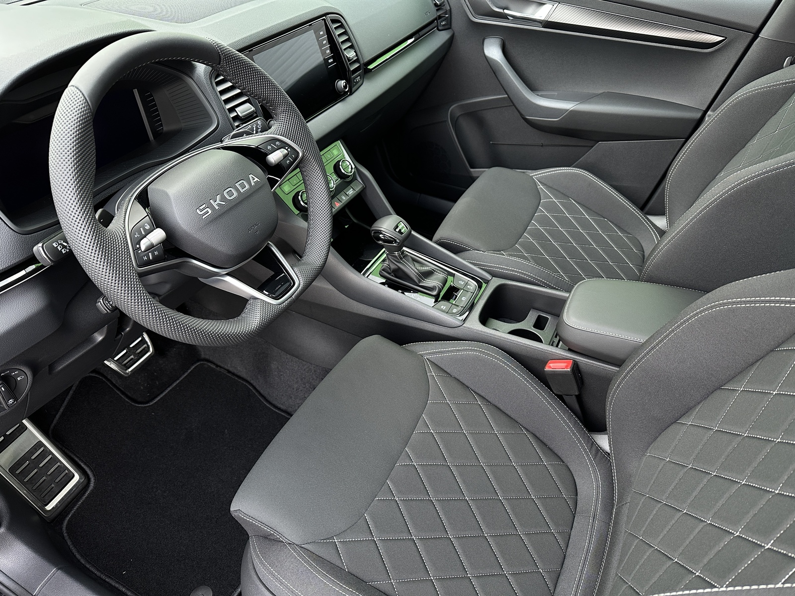 83/11066 Škoda Karoq Sportline 2.0TDi DSG 4x4 110kW/150PS Pohon všech kol 4x4, 7st. Automatická převodovka DSG, Tovární záruka Škoda Auto 5let/100.000km, Výbava vozu: Paket Drive PLUS - (Adaptivní podvozek - DCC, Progresivní řízení, Hliníkové kryty pedálů, Jízdní režim Offroad), Nezávislé topení s dálkovým ovládáním - Webasto, Tažné zařízení sklopné - el. odjistitelné, Kola z lehkých slitin ALU Škoda "SAGITARIUS" 8Jx19" Antracitová/Leštěná, 230V zásuvka a USB-C nabíjecí port pro cestující vzadu, Paket Asistovaná jízda 2.0 - (Prediktivní tempomat - ACC, Rozpoznávání dopravních značek, Adaptivní asistent pro udržování v jízdním pruhu - Lane Assist+, Asistent sledování mrtvého úhlu - Side Assist, Automatické parkování), Panoramatický kamerový systém 360°, Parkovací senzory vpředu a vzadu - PDC P/Z, Asistent varování a brzdění při hrozící kolizi s vozidly, chodci a cyklisty - Front Assist, Asistent rozpoznání únavy řidiče, Asistent rozjezdu do kopce, Systém Start/Stop, Volba jízdního režimu, Bezklíčové odemykání a startování - KESSY, Vyhřívaný multifunkční kožený volant pro DSG s pádly pod volantem - výškově a podélně nastavitelný, Kožená hlavice řadicí páky, Elektronická parkovací brzda, Sportovní přední sedadla, Bederní opěrky na předních sedadlech, Výškově nastavitelné sedadlo řidiče a spolujezdce, Dvouzónová automatická klimatizace - Climatronic, Vyhřívaná přední i zadní sedadla s oddělenou regulací, Loketní opěrka s Jumbo Boxem, Zadní loketní opěrka, Potah sedadel – látka, Vyhřívané čelní sklo, Vnitřní zpětné zrcátko s automatickým stmíváním, Elektrické ovládání oken vpředu i vzadu, Zatmavená zadní okna - Sunset, Vnější zpětná zrcátka elektricky sklopná, nastavitelná a vyhřívaná, Virtuální Cockpit, Infotainment Amundsen 8" s navigací, Hlasové ovládání a digitální asistentka Laura, Bezdrátový Smartlink, Bluetooth, DAB, Soundsystém CANTON, 10x Reproduktor, Digitální ekvalizér, Bezdrátové nabíjení telefonu, 2x USB-C vpředu, Ambientní LED osvětlení interiéru, Matrix-LED světlomety s neoslňujícím dálkovým světlem, Ostřikovače světlometů, Mlhové světlomety, Top-LED zadní světla s animovanými ukazateli směru jízdy, Senzor světla a deště, Kontrola tlaku v pneumatikách, Virtuální pedál - Otevírání víka kufru pohybem nohy pod zavazadlovým prostorem, Dekorativní lišty prahů, Černě lakované doplňky karoserie, ABS, ESP, 8x Airbag, Deaktivace airbagu spolujezdce, Centrální zamykání s dálkovým ovládáním, Nouzové volání SOS - eCall, Ocelové rezervní kolo, Střešní nosič, Zatížení nebržděného tažného zařízení - 750kg, Zatížení bržděného tažného zařízení - 2100kg, Nový vůz s registrací 23. 10. 2025. Servisní kniha + dokumentace Škoda Auto, Možnost odpočtu DPH 21%, Termín odběru a předání od 21. 04. 2026.