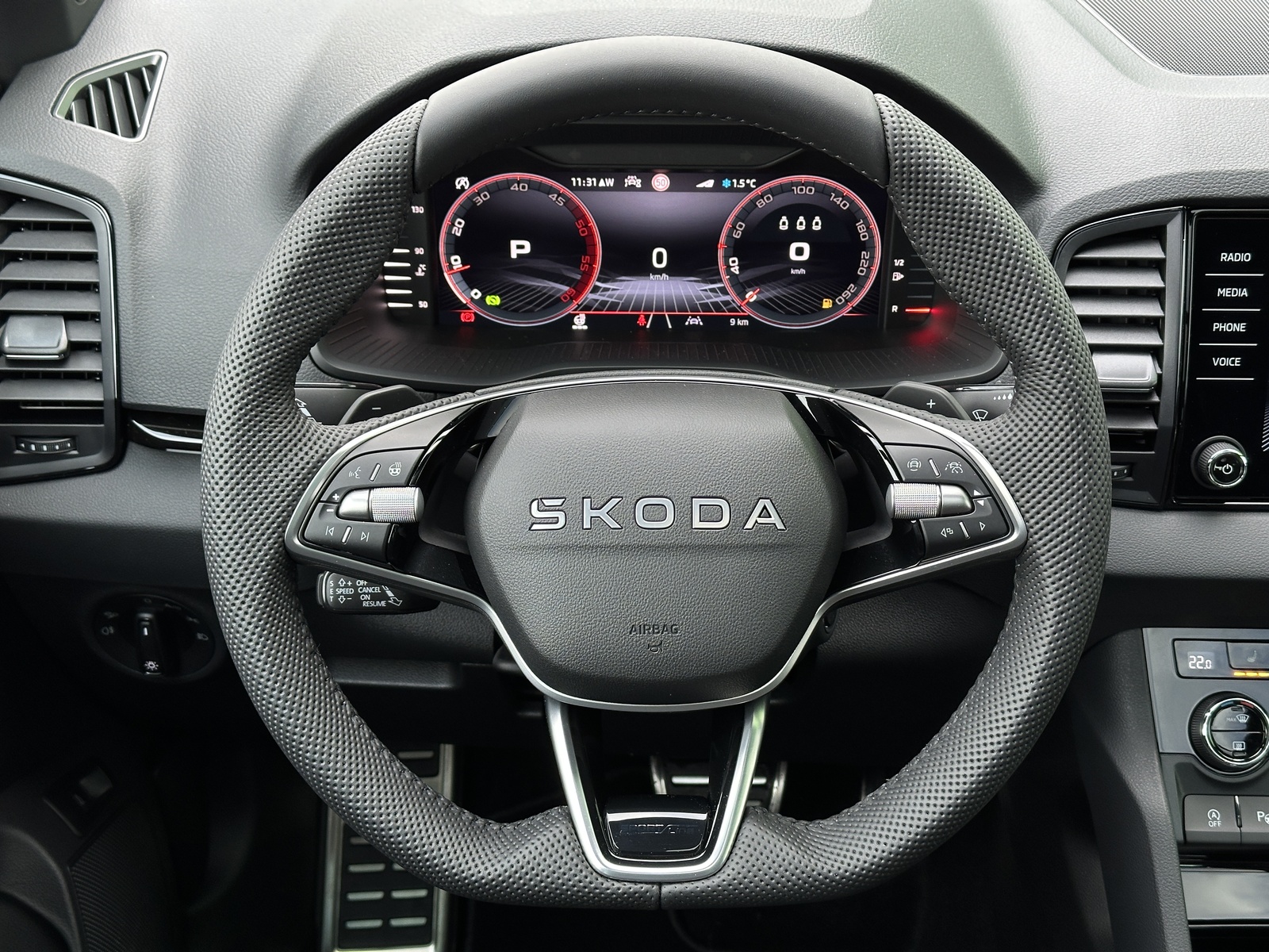 393/11072 Škoda Karoq Sportline 2.0TDi DSG 4x4 110kW/150PS Pohon všech kol 4x4, 7st. Automatická převodovka DSG, Tovární záruka Škoda Auto 5let/100.000km, Výbava vozu: Tažné zařízení sklopné - el. odjistitelné, 230V zásuvka a USB-C nabíjecí port pro cestující vzadu, Paket Asistovaná jízda 2.0 - (Prediktivní tempomat - ACC, Rozpoznávání dopravních značek, Adaptivní asistent pro udržování v jízdním pruhu - Lane Assist+, Asistent sledování mrtvého úhlu - Side Assist, Automatické parkování), Panoramatický kamerový systém 360°, Parkovací senzory vpředu a vzadu - PDC P/Z, Asistent varování a brzdění při hrozící kolizi s vozidly, chodci a cyklisty - Front Assist, Asistent rozpoznání únavy řidiče, Asistent rozjezdu do kopce, Systém Start/Stop, Volba jízdního režimu, Bezklíčové odemykání a startování - KESSY, Vyhřívaný multifunkční kožený volant pro DSG s pádly pod volantem - výškově a podélně nastavitelný, Kožená hlavice řadicí páky, Elektronická parkovací brzda, Sportovní přední sedadla, Bederní opěrky na předních sedadlech, Výškově nastavitelné sedadlo řidiče a spolujezdce, Dvouzónová automatická klimatizace - Climatronic, Vyhřívaná přední i zadní sedadla s oddělenou regulací, Loketní opěrka s Jumbo Boxem, Zadní loketní opěrka, Potah sedadel – látka, Vyhřívané čelní sklo, Vnitřní zpětné zrcátko s automatickým stmíváním, Elektrické ovládání oken vpředu i vzadu, Zatmavená zadní okna - Sunset, Vnější zpětná zrcátka elektricky sklopná, nastavitelná a vyhřívaná, Virtuální Cockpit, Infotainment Amundsen 8" s navigací, Hlasové ovládání a digitální asistentka Laura, Bezdrátový Smartlink, Bluetooth, DAB, Soundsystém CANTON, 10x Reproduktor, Digitální ekvalizér, Bezdrátové nabíjení telefonu, 2x USB-C vpředu, Ambientní LED osvětlení interiéru, Matrix-LED světlomety s neoslňujícím dálkovým světlem, Ostřikovače světlometů, Mlhové světlomety, Top-LED zadní světla s animovanými ukazateli směru jízdy, Senzor světla a deště, Kontrola tlaku v pneumatikách, Kola z lehkých slitin ALU Škoda "PROCYON" 7Jx18" Černá, Virtuální pedál - Otevírání víka kufru pohybem nohy pod zavazadlovým prostorem, Dekorativní lišty prahů, Černě lakované doplňky karoserie, ABS, ESP, 8x Airbag, Deaktivace airbagu spolujezdce, Centrální zamykání s dálkovým ovládáním, Nouzové volání SOS - eCall, Ocelové rezervní kolo, Střešní nosič, Zatížení nebržděného tažného zařízení - 750kg, Zatížení bržděného tažného zařízení - 2100kg, Nový vůz s registrací 20. 10. 2025. Servisní kniha + dokumentace Škoda Auto, Možnost odpočtu DPH 21%, Termín odběru a předání od 15. 04. 2026.