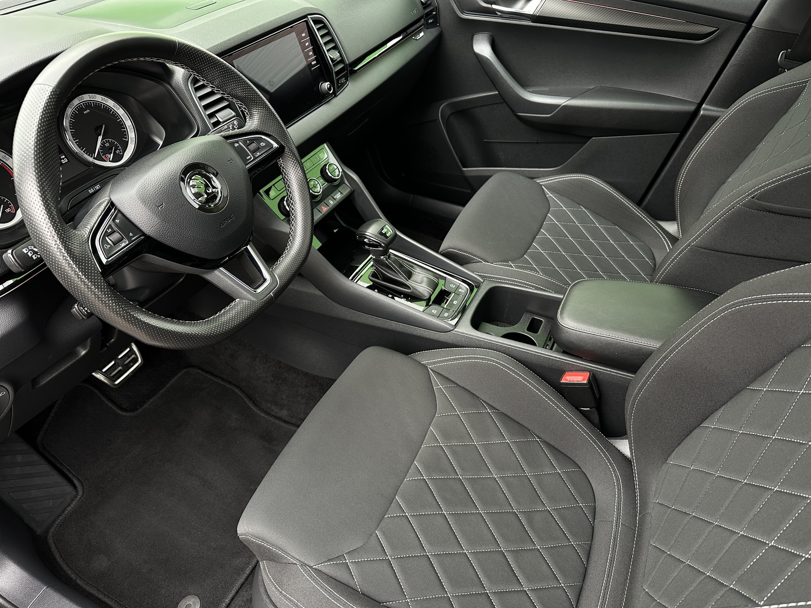 310/11092 Škoda Karoq Sportline 2.0TSi DSG 4x4 140kW/190PS, Pohon všech kol 4x4, 7st. Automatická převodovka DSG, Výbava vozu: Tažné zařízení sklopné – el. odjistitelné, Panoramatické střešní okno, Adaptivní podvozek – DCC, Infotainment s navigací Amundsen, Vyhřívané čelní sklo, Adaptivní tempomat – ACC, Kola z lehkých slitin ALU Škoda „SAGITARIUS“ 8Jx19" antracitová/leštěná, Front Assist – asistent varování a brzdění při hrozící kolizi s vozidly, chodci a cyklisty, Vyhřívaný multifunkční sportovní kožený volant pro DSG s pádly pro řazení pod volantem, Rezervní ocelové kolo, Sportovní nárazníky, Černě lakované doplňky karoserie, Sportovní sedadla, Sportovní kryty pedálů, Dekorativní prahové lišty, Střešní nosič – černý lesklý, Elektronický program stability – ESP, Bi-LED přední světlomety s automatickou regulací pro jízdu do zatáčky, LED denní svícení, WLAN, Bluetooth, DAB – digitální příjem rádia, USB, Bezdrátové nabíjení telefonu, Volba jízdních režimů, Off-Road režim, Isofix, Manuální nastavení předních sedadel, Bederní opěrky, Přední a zadní loketní opěrka, Parkovací senzory vzadu – PDC, Parkovací kamera vzadu – KAMERA, Vyhřívání předních a zadních sedadel, El. otevírání víka zavazadlového prostoru, KESSY – bezklíčové zamykání a startování, Sunset – zatmavená zadní okna, Vnitřní zpětné zrcátko s automatickým zatmavováním, El. stahování předních a zadních oken, 8x airbag, Vnější zpětná zrcátka el. sklopná a nastavitelná – vyhřívaná, Senzor tlaku v pneumatikách, Start/Stop systém, Vyhřívané ostřikovače čelního okna, SmartLink – zrcadlení aplikací z telefonu na infotainment vozidla, Senzor únavy řidiče, Potah sedadel – látka, Nouzový systém volání SOS – eCall, Hlasové ovládání, Ambientní osvětlení, Rozpoznání dopravních značek, Asistent rozjezdu do kopce, Servisní kniha + dokumentace Škoda Auto, Skladem - ihned k odběru.