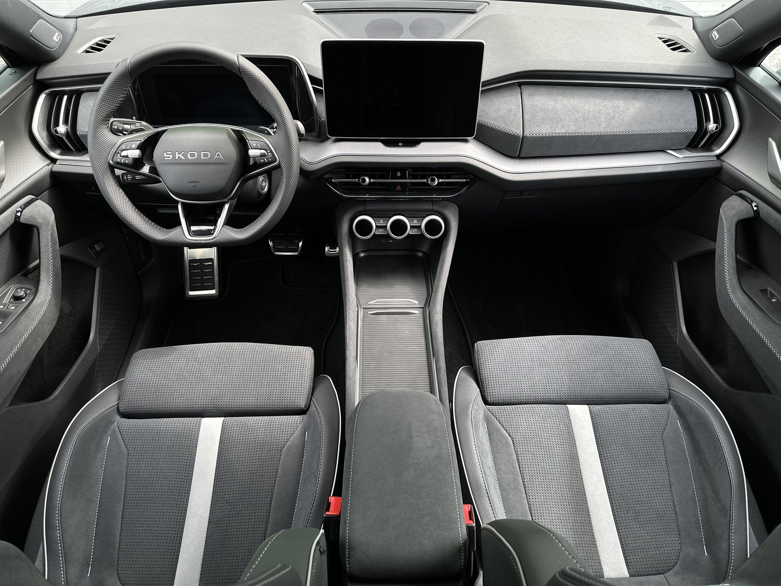 324/11296 Škoda Kodiaq Sportline 2.0TDi 4x4 DSG 142kW/193PS, 7st. Automatická převodovka DSG, Pohon všech kol 4x4, Tovární záruka Škoda Auto 5let/100.000km, Výbava vozu: Paket Family - (Rolety zadních oken, Zadní boční airbagy, Držák na tablet, Ochrana dveří), Paket Drive PLUS - (Adaptivní podvozek - DCC+, Progresivní řízení, Volba jízdního režimu), Paket Comfort PLUS - (Bezklíčové zamykání a startování - KESSY, Alarm, Elektrické otevírání víka zavazadlového prostoru, Elektricky nastavitelné sedadlo řidiče, Virtual Pedal - otevírání víka kufru pohybem nohy pod zavazadlovým prostorem, Elektricky nastavitelná přední sedadla, Dvojitá podlaha v zavazadlovém prostoru, Soundsystém CANTON, Ocelové rezervní kolo), Vyhřívané čelní sklo, Nezávislé topení s dálkovým ovládáním - Webasto, Kola z lehkých slitin ALU Škoda "RILA AERO" 8Jx20" Antracitová/Leštěná, Tažné zařízení sklopné - el. odjistitelné, Třetí řada sedadel - 7 MíST k sezení, Paket Asistovaná jízda 1.5 PLUS - (Prediktivní tempomat - ACC, Adaptivní asistent vedení v jízdním pruhu - Lane Assist), Matrix-LED přední světlomety, LED zadní světla s animovanými směrovkami, KESSY s alarmem – bezklíčové odemykání a startování, Elektrické otevírání víka zavazadlového prostoru, Elektricky nastavitelné sedadlo řidiče, Vyhřívaná zadní sedadla, Vyhřívaný multifunkční kožený volant, Infotainment Navi 13" – internetové rádio, čistič obrazovky, Ambientní LED osvětlení interiéru, Vyhřívaná přední sedadla, Třízónová klimatizace Climatronic, Sunset - zatmavená zadní skla, Rozpoznávání dopravních značek s kontrolou rychlosti ISA, Front Assist – varování a brzdění při hrozící kolizi s vozidly, chodci a cyklisty, Asistent pro průjezd křižovatkou, Asistent hlídání mrtvého úhlu – Side Assist, Antikolizní asistent, Senzor tlaku v pneumatikách, Tempomat, Asistent rozjezdu do kopce, Parkovací senzory vpředu a vzadu – PDC P/Z, Zadní parkovací KAMERA, Asistent upozornění na únavu řidiče, 7x airbag, 2x i-Size a 2x Top Tether vzadu a 1x i-Size vpředu pro spolujezdce, Bezdrátové nabíjení telefonu (15 W), Nouzové volání SOS – eCall, Startování tlačítkem, Centrální zamykání s dálkovým ovládáním, Virtual Cockpit 10", Světelný a dešťový senzor, Vnější zpětná zrcátka elektricky nastavitelná, sklopná a vyhřívaná, Elektronická parkovací brzda s funkcí Auto Hold, Elektrické ovládání oken vpředu i vzadu, Středová konzola s držáky nápojů, 12V zásuvka vpředu, 5x USB-C – 2x vpředu (45 W), 2x vzadu (45 W), 1x u vnitřního zpětného zrcátka (15 W), Deštník ve dveřích řidiče, Zadní loketní opěrka, 12V zásuvka v zavazadlovém prostoru, Příprava pro tažné zařízení, Leskle černé lakovaní doplňků karoserie Sportline, Interiér Sportline – Suedia/umělá kůže, Nabíjecí kabel Mode-3 (pouze iV), Nový vůz s registrací, Servisní kniha + dokumentace Škoda Auto, Možnost odpočtu DPH 21%, Skladem - ihned k odběru.
