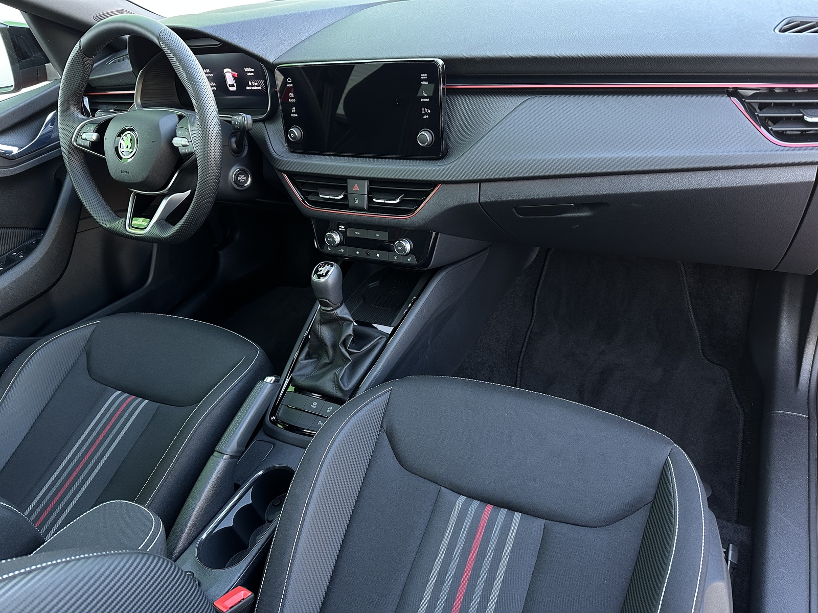 353/11172 Škoda Scala Monte Carlo 1.0TSi 85kW/116PS, 6.st Manuální převodovka, Tovární záruka Škoda Auto 5let/100.000km, Výbava vozu: Paket Asistovaná jízda 1.5 PLUS - (Adaptivní tempomat - ACC, Adaptivní asistent udržování v jízdním pruhu - Adaptivní Lane Assist, Asistent hlídání mrtvého úhlu - Side Assist), Vyhřívané čelní sklo, Dvojitá podlaha v zavazadlovém prostoru, Kola z lehkých slitin ALU Škoda "URSA" 7Jx18" Černá/Leštěná, Parkovací kamera vzadu, Parkovací senzory vpředu a vzadu - PDC P/Z, Panoramatická střecha, Asistent varování a brzdění při hrozící kolizi s vozidly, chodci a cyklisty - Front Assist, Asistent rozpoznání únavy řidiče, Asistent rozjezdu do kopce, Rozpoznávání dopravních značek, Systém Start/Stop, Volba jízdního režimu, Bezklíčové odemykání a startování - KESSY, Vyhřívaný multifunkční kožený volant pro DSG s pádly pod volantem - výškově a podélně nastavitelný, Kožená hlavice řadicí páky a madlo ruční brzdy, Sportovní přední sedadla, Bederní opěrky na předních sedadlech, Výškově nastavitelné sedadlo řidiče a spolujezdce, Dvouzónová automatická klimatizace - Climatronic, Vyhřívaná přední sedadla s oddělenou regulací, Loketní opěrka s Jumbo Boxem, Zadní loketní opěrka, Sportovní interiér Monte Carlo s černou stropnicí, Potah sedadel – látka, Vnitřní zpětné zrcátko s automatickým stmíváním, Elektrické ovládání oken vpředu i vzadu, Zatmavená zadní okna - Sunset, Vnější zpětná zrcátka elektricky sklopná, nastavitelná a vyhřívaná, Virtuální Cockpit, Infotainment Media 8", Bezdrátový Smartlink, Bluetooth, DAB, 8x reproduktor, Bezdrátové nabíjení telefonu, 2x USB-C a 12V zásuvka předu i vzadu, Ambientní LED osvětlení interiéru, Matrix-LED přední světlomety, Mlhové světlomety, LED zadní světla s animovanými ukazateli směru jízdy, Senzor světla a deště, Kontrola tlaku v pneumatikách, Sada na opravu pneumatik, Sportovní kryty pedálů, Dekorativní prahové lišty, Černě lakované doplňky karoserie, 3x Isofix a Top Tether, ABS, ESP, 6x Airbag, Deaktivace airbagu spolujezdce, Nouzové volání SOS - eCall, Zatížení nebržděného tažného zařízení - 600kg, Zatížení bržděného tažného zařízení - 1200kg, Nový vůz s registrací, Servisní kniha + dokumentace Škoda Auto, Možnost odpočtu DPH 21%, Termín odběru a předání od 15.4.2026.