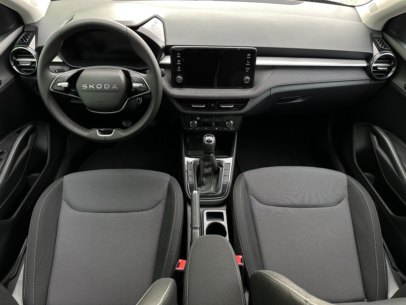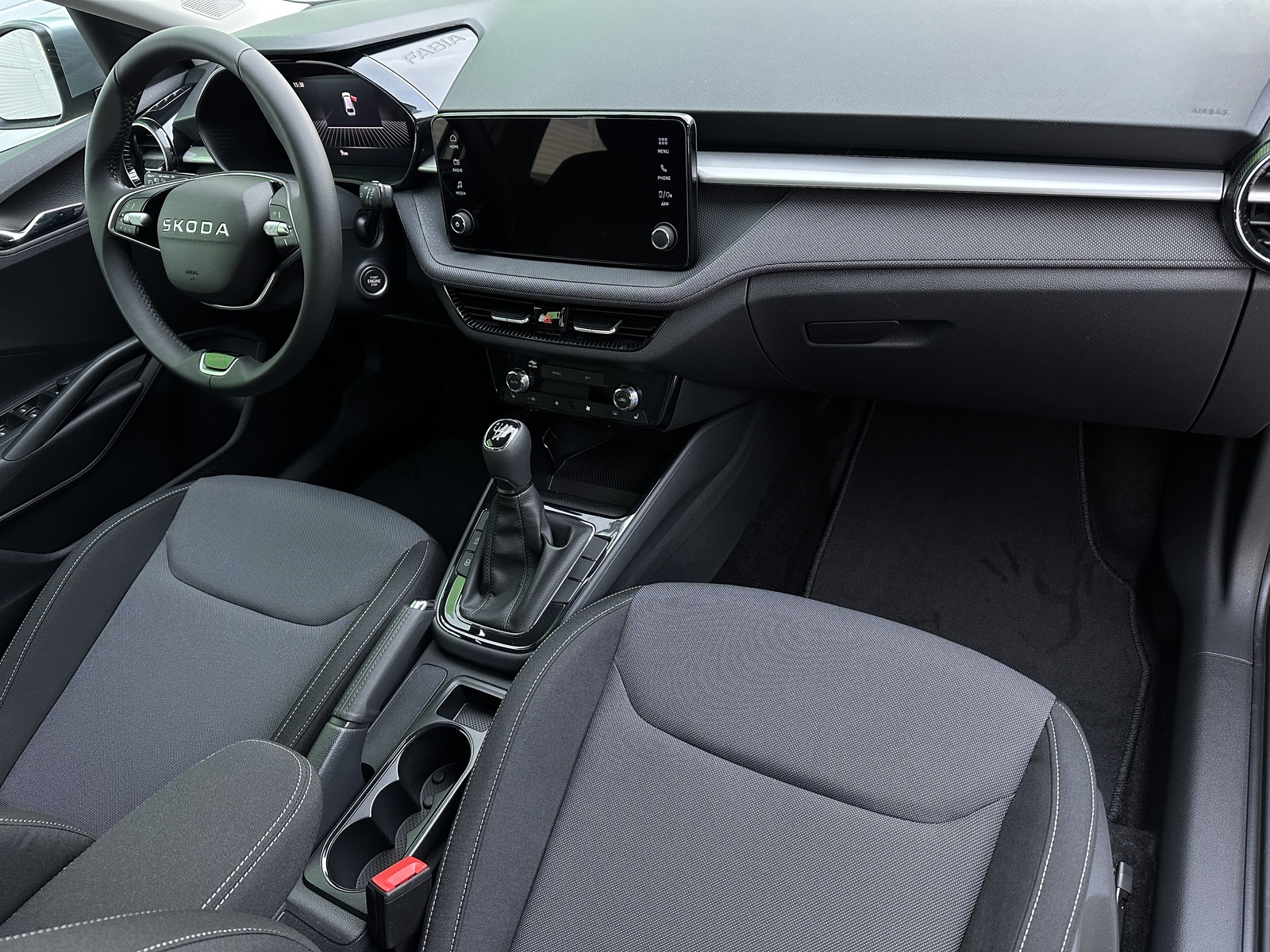 207/11115 Škoda Fabia 1.0TSi 70kW/95PS, 5st. Manuální převodovka, Tovární záruka Škoda Auto 5let/100.000km, Výbava vozu: Paket Interiér PLUS - (Dvouzónová automatická klimatizace - Climatronic, Bezdrátový Smartlink, 6x Reproduktor), Kola z lehkých slitin ALU Škoda "ROTARE AERO" 5,5Jx15" Černá, Parkovací KAMERA vzadu, Parkovací senzory vzadu - PDC/Z, Asistent udržování v jízdním pruhu - Lane Assist, Asistent varování a brzdění při hrozící kolizi s vozidly, chodci a cyklisty - Front Assist, Asistent rozpoznání únavy řidiče, Asistent rozjezdu do kopce, Rozpoznávání dopravních značek, Systém Start/Stop, Startování tlačítkem, Tempomat s omezovačem rychlosti, Multifunkční kožený volant pro DSG s pádly pod volantem - výškově a podélně nastavitelný, Kožená hlavice řadicí páky a madlo ruční brzdy, Bederní opěrky na předních sedadlech, Výškově nastavitelné sedadlo řidiče a spolujezdce, Vyhřívaná přední sedadla s oddělenou regulací, Přední loketní opěrka, Tříbodové automatické bezpečnostní pásy vzadu, Potah sedadel – látka, Vnitřní zpětné zrcátko s automatickým stmíváním, Elektrické ovládání oken vpředu i vzadu, Vnější zpětná zrcátka elektricky nastavitelná a vyhřívaná, Virtuální Cockpit, Infotainment Media 8", Bluetooth, DAB, 2x USB-C vpředu, LED hlavní světlomety, Světelný senzor, Zadní stěrač s ostřikovačem, Centrální zamykání s dálkovým ovládáním, Kontrola tlaku v pneumatikách, Sada na opravu pneumatik, ABS, ESP, 6x Airbag, Deaktivace airbagu spolujezdce, NOVÝ VŮZ ČR, Servisní kniha + dokumentace Škoda Auto, Možnost odpočtu DPH 21%, Skladem - ihned k odběru.