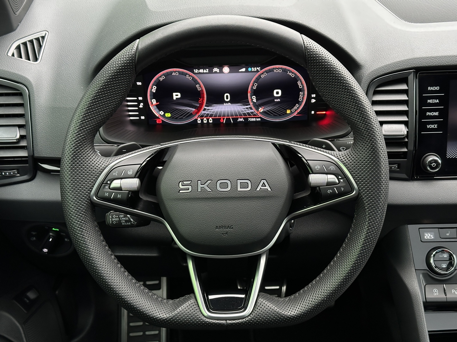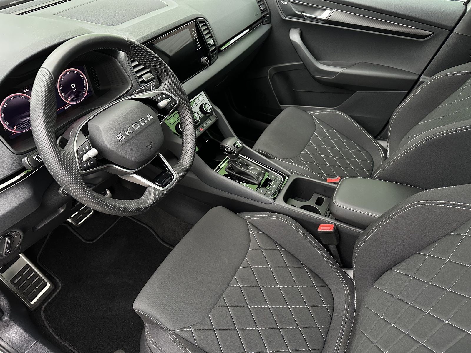 130/10712 Škoda Karoq Sportline 2.0TSi 4x4 DSG 140kW/190PS, Pohon všech kol 4x4, 7st. Automatická převodovka DSG, Šedá Steel, Tovární záruka Škoda Auto 03/2030 nebo 100.000km, Výbava vozu: Paket Drive PLUS - (Adaptivní podvozek DCC, Progresivní řízení, Hliníkové kryty pedálů, Volba jízních režimů + Off Road funkce), Nezávislé topení s dálkovým ovládáním - Webasto, Tažné zařízení sklopné - el. odjistitelné, Panoramatické střešní okno, Kola z lehkých slitin ALU Škoda "SAGITARIUS" 8Jx19" antracitová/leštěná, 230V zásuvka a nabíjecí USB-C port pro cestující vzadu, Paket Asistovaná jízda 2.0 – (Prediktivní tempomat – ACC, Asistent rozpoznávání dopravních značek, Adaptivní asistent pro udržování v jízdním pruhu – Lane Assist+, Asistent pro sledování mrtvého úhlu – Side Assist, Automatické parkování), Asistent rozjezdu do kopce, Volba jízdního režimu, 12V zásuvka v zavazadlovém prostoru, Asistent únavy řidiče, Bezdrátový SmartLink, Infotainment s Navigací 8", DAB – Digitální příjem rádia, Dvouzónová automatická klimatizace – Climatronic, Vnější zpětná zrcátka elektricky nastavitelná, sklopná, vyhřívaná, Hlasové ovládání, Digitální asistentka Laura, Jumbo box s loketní opěrkou, Kontrola tlaku v pneumatikách, Systém nouzového volání SOS – eCall+, 8x airbag, Výškově nastavitelná přední sedadla s bederní opěrkou, Elektrické ovládání předních a zadních oken, Sunset - zatmavená zadní skla, Světelný a dešťový senzor, USB-C vpředu, Ambientní LED osvětlení interiéru, KESSY – bezklíčové zamykání a startování, Nouzový asistent, Matrix-LED hlavní světlomety, Ostřikovače předních světlometů, Top-LED zadní světla s animovanými směrovými světly, Přední sportovní sedadla, Vyhřívaná přední a zadní sedadla, Potah sedadel – látka, Střešní nosič – lesklá černá, Vyhřívané trysky ostřikovačů čelního skla, Panoramatický kamerový systém 360°, Parkovací senzory přední a zadní – PDC, Virtuální pedál - komfortní elektrické otvírání zavazadlového prostoru, Vyhřívané čelní sklo, Virtual Cockpit 10", USB-C pro vnitřní zrcátko, Soundsystém CANTON – 10 reproduktorů + Digitální ekvalizér, Vyhřívaný kožený sportovní multifunkční volant s pádly řazení pro DSG, Sportovní kryty pedálů, Černě lakované doplňky karoserie, Dekorativní prahy dveří, Exteriér Sportline, Ocelové rezervní kolo, Zánovní vůz, Servisní kniha + kompletní dokumentace Škoda Auto, Možnost odpočtu DPH 21%, Skladem - ihned k odběru.