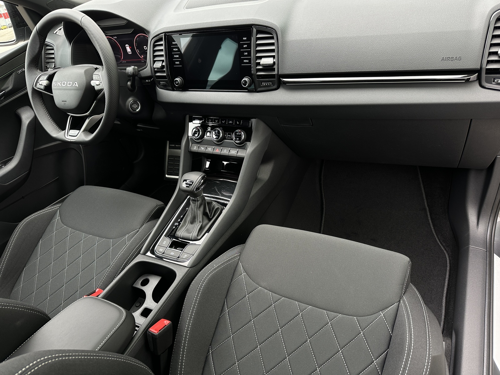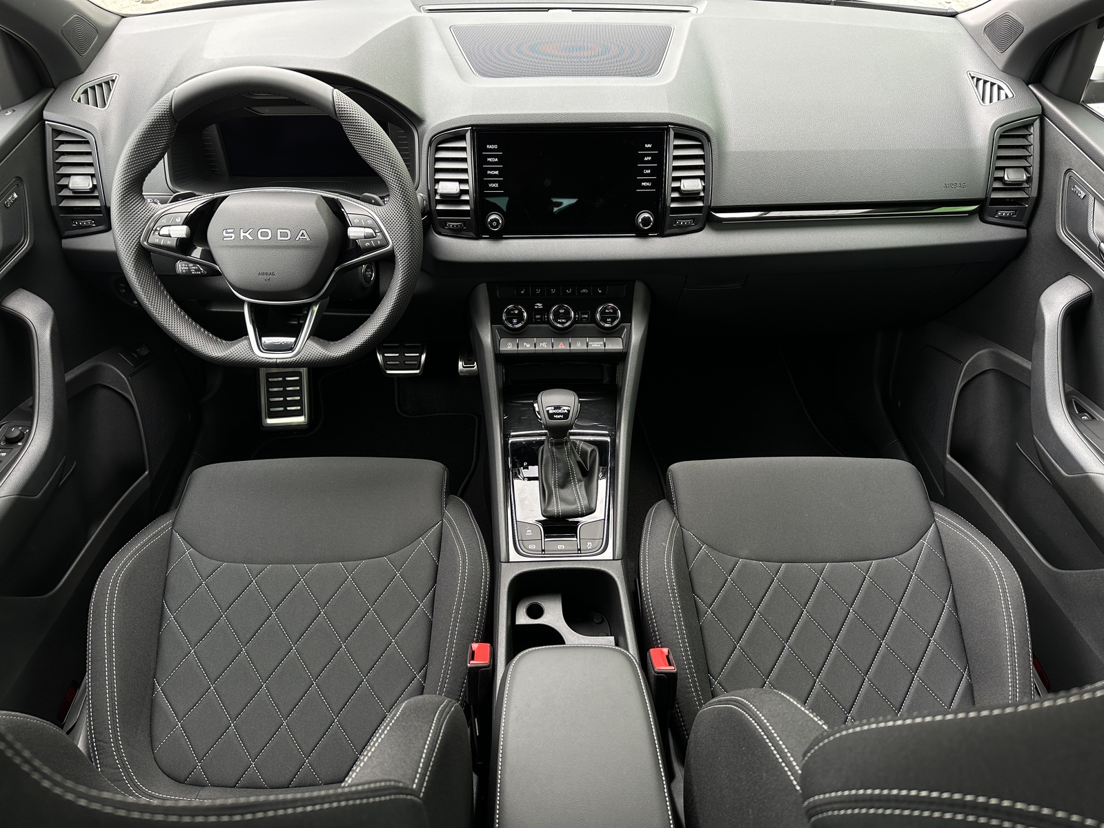393/11072 Škoda Karoq Sportline 2.0TDi DSG 4x4 110kW/150PS Pohon všech kol 4x4, 7st. Automatická převodovka DSG, Tovární záruka Škoda Auto 5let/100.000km, Výbava vozu: Tažné zařízení sklopné - el. odjistitelné, 230V zásuvka a USB-C nabíjecí port pro cestující vzadu, Paket Asistovaná jízda 2.0 - (Prediktivní tempomat - ACC, Rozpoznávání dopravních značek, Adaptivní asistent pro udržování v jízdním pruhu - Lane Assist+, Asistent sledování mrtvého úhlu - Side Assist, Automatické parkování), Panoramatický kamerový systém 360°, Parkovací senzory vpředu a vzadu - PDC P/Z, Asistent varování a brzdění při hrozící kolizi s vozidly, chodci a cyklisty - Front Assist, Asistent rozpoznání únavy řidiče, Asistent rozjezdu do kopce, Systém Start/Stop, Volba jízdního režimu, Bezklíčové odemykání a startování - KESSY, Vyhřívaný multifunkční kožený volant pro DSG s pádly pod volantem - výškově a podélně nastavitelný, Kožená hlavice řadicí páky, Elektronická parkovací brzda, Sportovní přední sedadla, Bederní opěrky na předních sedadlech, Výškově nastavitelné sedadlo řidiče a spolujezdce, Dvouzónová automatická klimatizace - Climatronic, Vyhřívaná přední i zadní sedadla s oddělenou regulací, Loketní opěrka s Jumbo Boxem, Zadní loketní opěrka, Potah sedadel – látka, Vyhřívané čelní sklo, Vnitřní zpětné zrcátko s automatickým stmíváním, Elektrické ovládání oken vpředu i vzadu, Zatmavená zadní okna - Sunset, Vnější zpětná zrcátka elektricky sklopná, nastavitelná a vyhřívaná, Virtuální Cockpit, Infotainment Amundsen 8" s navigací, Hlasové ovládání a digitální asistentka Laura, Bezdrátový Smartlink, Bluetooth, DAB, Soundsystém CANTON, 10x Reproduktor, Digitální ekvalizér, Bezdrátové nabíjení telefonu, 2x USB-C vpředu, Ambientní LED osvětlení interiéru, Matrix-LED světlomety s neoslňujícím dálkovým světlem, Ostřikovače světlometů, Mlhové světlomety, Top-LED zadní světla s animovanými ukazateli směru jízdy, Senzor světla a deště, Kontrola tlaku v pneumatikách, Kola z lehkých slitin ALU Škoda "PROCYON" 7Jx18" Černá, Virtuální pedál - Otevírání víka kufru pohybem nohy pod zavazadlovým prostorem, Dekorativní lišty prahů, Černě lakované doplňky karoserie, ABS, ESP, 8x Airbag, Deaktivace airbagu spolujezdce, Centrální zamykání s dálkovým ovládáním, Nouzové volání SOS - eCall, Ocelové rezervní kolo, Střešní nosič, Zatížení nebržděného tažného zařízení - 750kg, Zatížení bržděného tažného zařízení - 2100kg, Nový vůz s registrací 20. 10. 2025. Servisní kniha + dokumentace Škoda Auto, Možnost odpočtu DPH 21%, Termín odběru a předání od 15. 04. 2026.