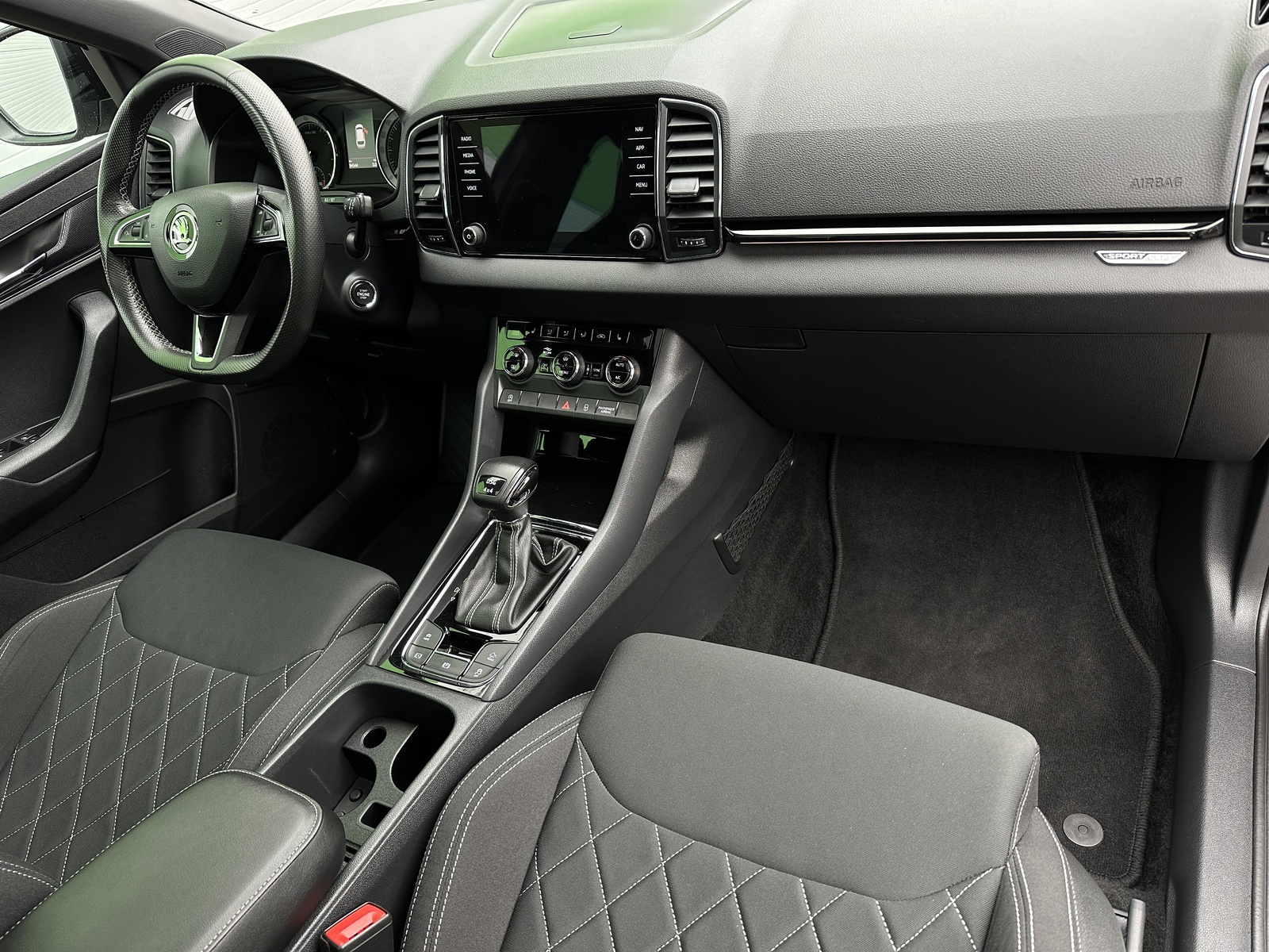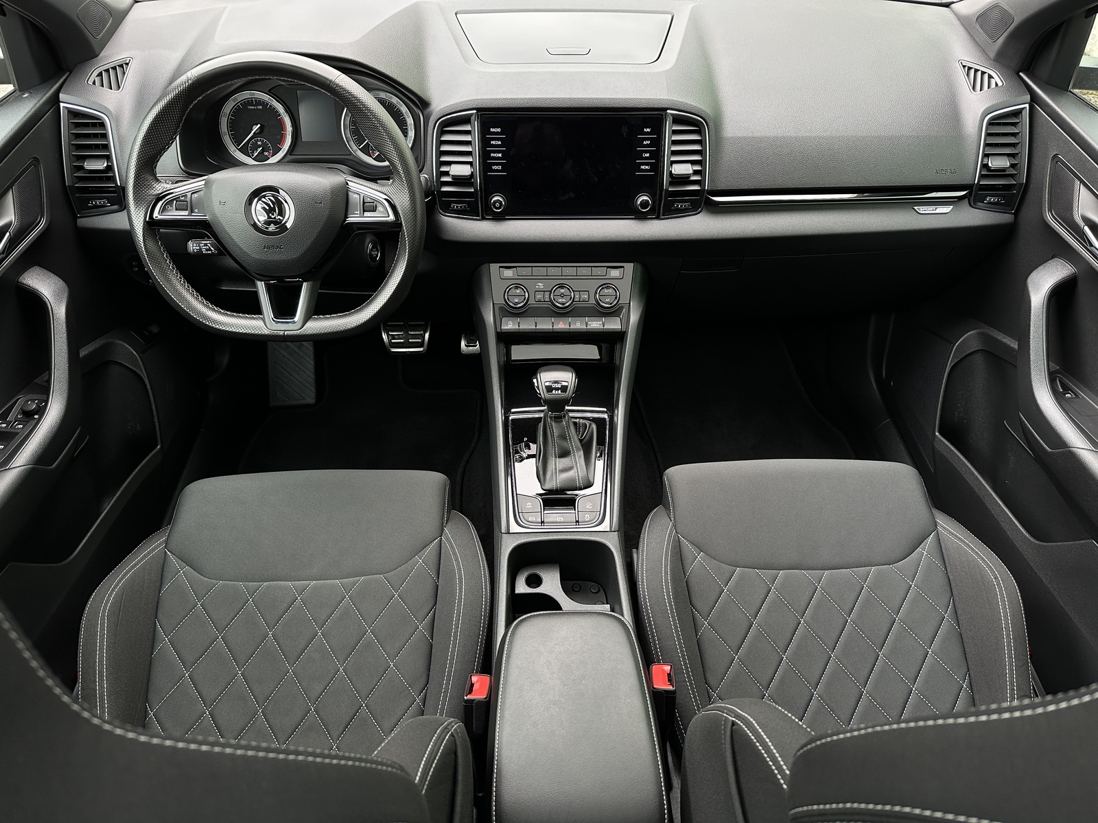 310/11092 Škoda Karoq Sportline 2.0TSi DSG 4x4 140kW/190PS, Pohon všech kol 4x4, 7st. Automatická převodovka DSG, Výbava vozu: Tažné zařízení sklopné – el. odjistitelné, Panoramatické střešní okno, Adaptivní podvozek – DCC, Infotainment s navigací Amundsen, Vyhřívané čelní sklo, Adaptivní tempomat – ACC, Kola z lehkých slitin ALU Škoda „SAGITARIUS“ 8Jx19" antracitová/leštěná, Front Assist – asistent varování a brzdění při hrozící kolizi s vozidly, chodci a cyklisty, Vyhřívaný multifunkční sportovní kožený volant pro DSG s pádly pro řazení pod volantem, Rezervní ocelové kolo, Sportovní nárazníky, Černě lakované doplňky karoserie, Sportovní sedadla, Sportovní kryty pedálů, Dekorativní prahové lišty, Střešní nosič – černý lesklý, Elektronický program stability – ESP, Bi-LED přední světlomety s automatickou regulací pro jízdu do zatáčky, LED denní svícení, WLAN, Bluetooth, DAB – digitální příjem rádia, USB, Bezdrátové nabíjení telefonu, Volba jízdních režimů, Off-Road režim, Isofix, Manuální nastavení předních sedadel, Bederní opěrky, Přední a zadní loketní opěrka, Parkovací senzory vzadu – PDC, Parkovací kamera vzadu – KAMERA, Vyhřívání předních a zadních sedadel, El. otevírání víka zavazadlového prostoru, KESSY – bezklíčové zamykání a startování, Sunset – zatmavená zadní okna, Vnitřní zpětné zrcátko s automatickým zatmavováním, El. stahování předních a zadních oken, 8x airbag, Vnější zpětná zrcátka el. sklopná a nastavitelná – vyhřívaná, Senzor tlaku v pneumatikách, Start/Stop systém, Vyhřívané ostřikovače čelního okna, SmartLink – zrcadlení aplikací z telefonu na infotainment vozidla, Senzor únavy řidiče, Potah sedadel – látka, Nouzový systém volání SOS – eCall, Hlasové ovládání, Ambientní osvětlení, Rozpoznání dopravních značek, Asistent rozjezdu do kopce, Servisní kniha + dokumentace Škoda Auto, Skladem - ihned k odběru.