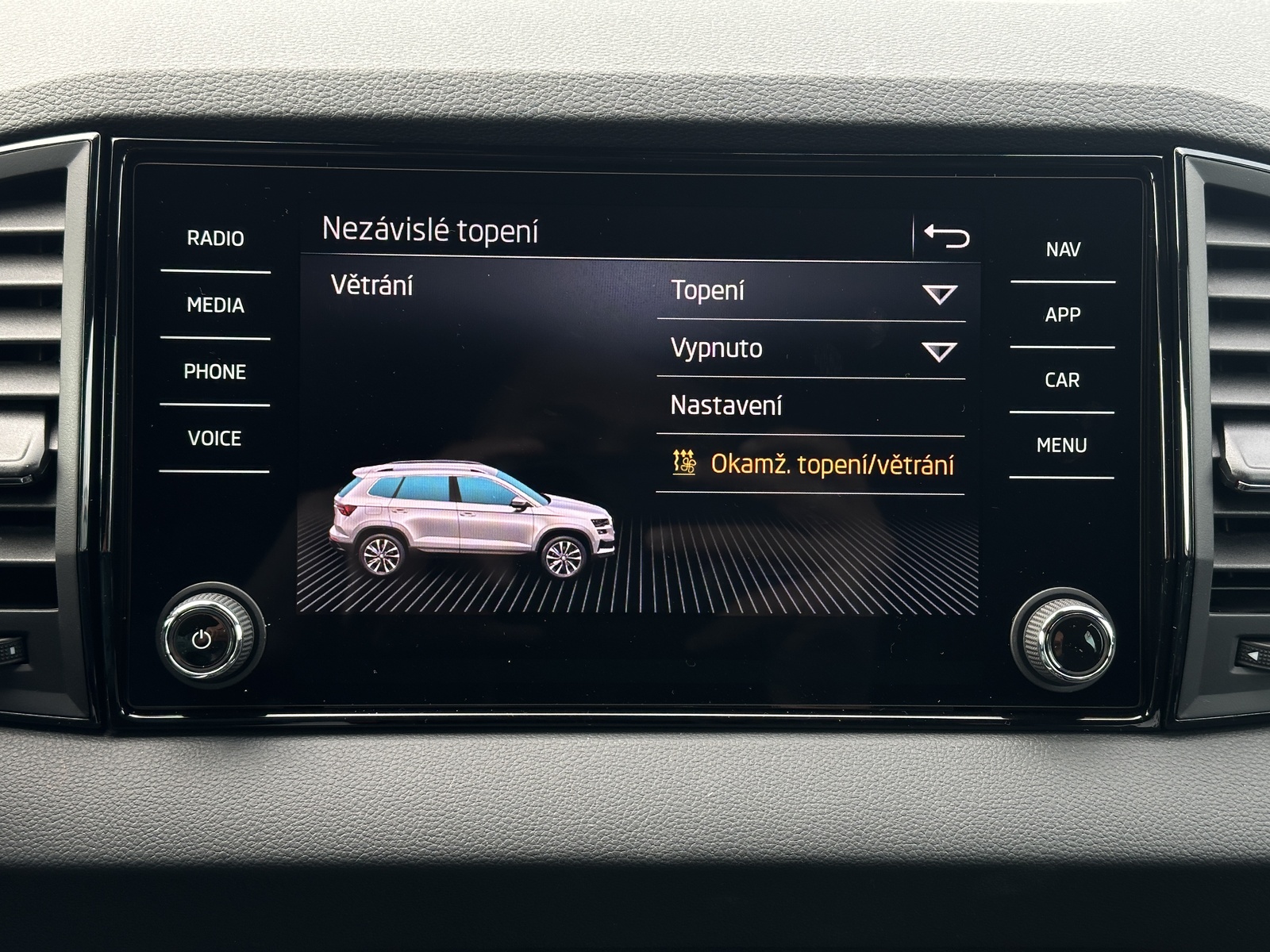 384/11179 Škoda Karoq Sportline 2.0TDi DSG 4x4 110kW/150PS, Pohon všech kol 4x4, 7st. Automatická převodovka DSG, Tovární záruka Škoda Auto 5let/100.000km, Výbava vozu: Nezávislé topení s dálkovým ovládáním - Webasto, Tažné zařízení sklopné - el. odjistitelné, Panoramatické střešní okno, Kola z lehkých slitin ALU Škoda "SAGITARIUS" 8Jx19" Antracitová/Leštěná, 230V zásuvka a USB-C nabíjecí port pro cestující vzadu, Paket Asistovaná jízda 2.0 - (Prediktivní tempomat - ACC, Rozpoznávání dopravních značek, Adaptivní asistent pro udržování v jízdním pruhu - Lane Assist+, Asistent sledování mrtvého úhlu - Side Assist, Automatické parkování), Panoramatický kamerový systém 360°, Parkovací senzory vpředu a vzadu - PDC P/Z, Asistent varování a brzdění při hrozící kolizi s vozidly, chodci a cyklisty - Front Assist, Asistent rozpoznání únavy řidiče, Asistent rozjezdu do kopce, Systém Start/Stop, Volba jízdního režimu, Bezklíčové odemykání a startování - KESSY, Vyhřívaný multifunkční kožený volant pro DSG s pádly pod volantem - výškově a podélně nastavitelný, Kožená hlavice řadicí páky, Elektronická parkovací brzda, Sportovní přední sedadla, Bederní opěrky na předních sedadlech, Výškově nastavitelné sedadlo řidiče a spolujezdce, Dvouzónová automatická klimatizace - Climatronic, Vyhřívaná přední i zadní sedadla s oddělenou regulací, Loketní opěrka s Jumbo Boxem, Zadní loketní opěrka, Potah sedadel – látka, Vyhřívané čelní sklo, Vnitřní zpětné zrcátko s automatickým stmíváním, Elektrické ovládání oken vpředu i vzadu, Zatmavená zadní okna - Sunset, Vnější zpětná zrcátka elektricky sklopná, nastavitelná a vyhřívaná, Virtuální Cockpit, Infotainment Amundsen 8" s navigací, Hlasové ovládání a digitální asistentka Laura, Bezdrátový Smartlink, Bluetooth, DAB, Soundsystém CANTON, 10x Reproduktor, Digitální ekvalizér, Bezdrátové nabíjení telefonu, 2x USB-C vpředu, Ambientní LED osvětlení interiéru, Matrix-LED světlomety s neoslňujícím dálkovým světlem, Ostřikovače světlometů, Mlhové světlomety, Top-LED zadní světla s animovanými ukazateli směru jízdy, Senzor světla a deště, Kontrola tlaku v pneumatikách, Virtuální pedál - Otevírání víka kufru pohybem nohy pod zavazadlovým prostorem, Dekorativní lišty prahů, Černě lakované doplňky karoserie, ABS, ESP, 8x Airbag, Deaktivace airbagu spolujezdce, Centrální zamykání s dálkovým ovládáním, Nouzové volání SOS - eCall, Ocelové rezervní kolo, Střešní nosič, Zatížení nebržděného tažného zařízení - 750kg, Zatížení bržděného tažného zařízení - 2100kg, Nový vůz s registrací, Servisní kniha + dokumentace Škoda Auto, Možnost odpočtu DPH 21%, Termín odběru a předání od 15.04.2026.