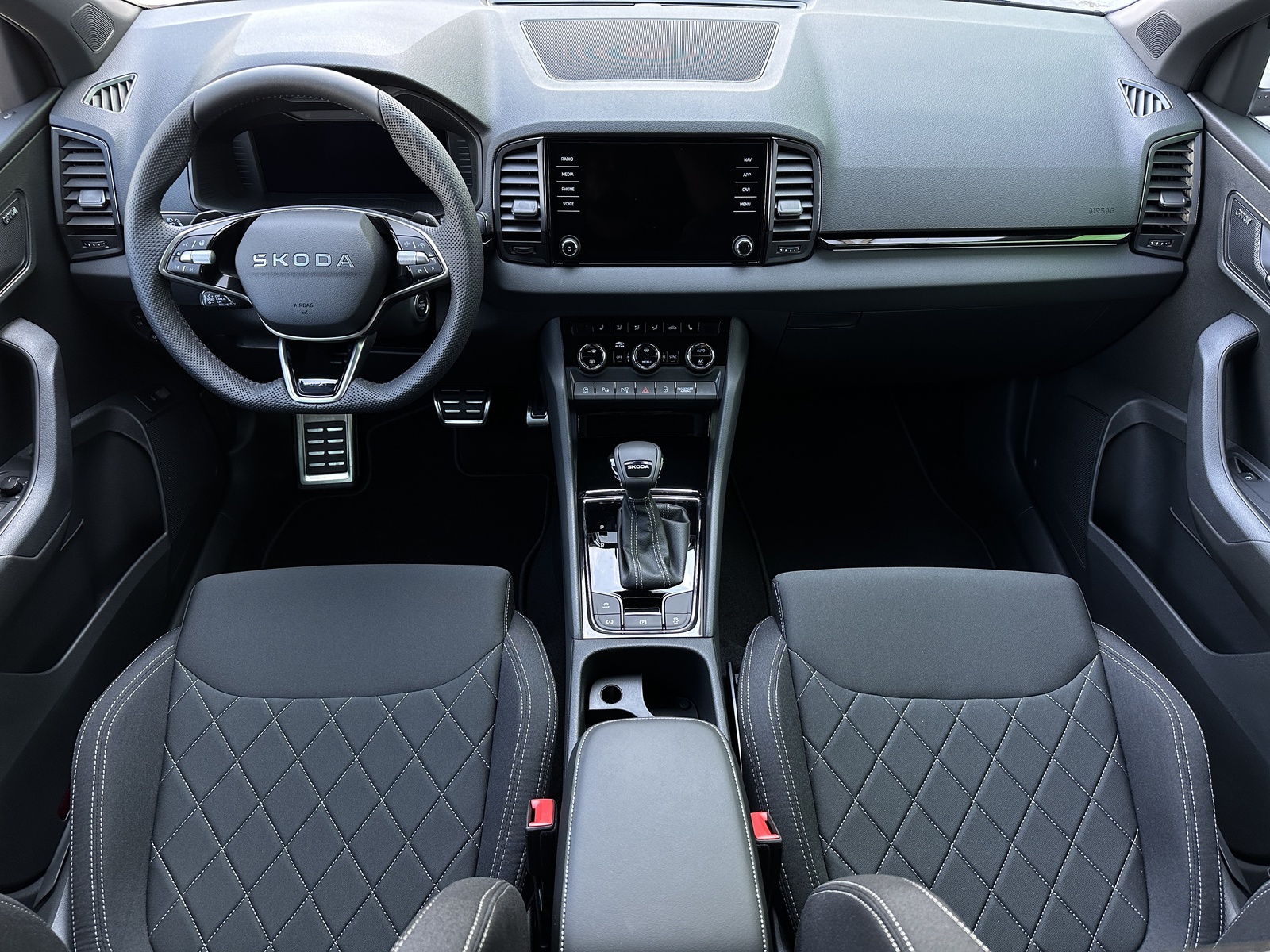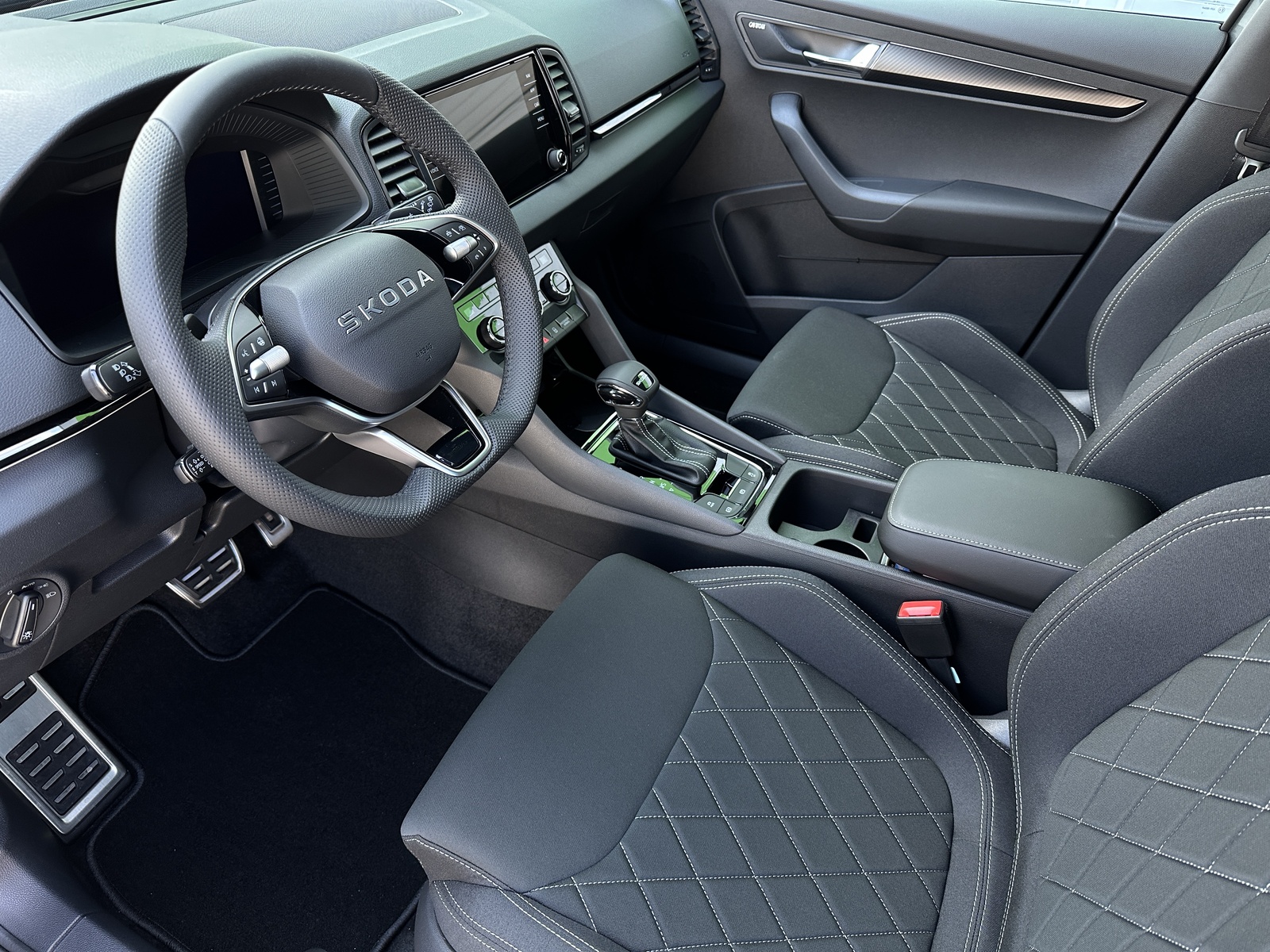 392/11298 Škoda Karoq Sportline 1.5TSi DSG 110kW/150PS, 7st. Automatická převodovka, Tovární záruka Škoda Auto 5let/100.000km, Výbava vozu: Tažné zařízení sklopné - el. odjistitelné, Kola z lehkých slitin ALU Škoda "SAGITARIUS" 8Jx19" Antracitová/Leštěná, 230V zásuvka a nabíjecí port USB-C pro cestující vzadu, Asistovaná jízda 2.0 - (Prediktivní tempomat - ACC, Rozpoznávání dopravních značek, Adaptivní asistent pro udržování jízdního pruhu – Lane Assist+, Asistent hlídání mrtvého úhlu – Side Assist, Automatické parkování), Panoramatický kamerový systém 360°KAMERA, Parkovací senzory přední a zadní - PDC P/Z, Asistent varování a brzdění při hrozící kolizi s vozidly, chodci a cyklisty - Front Assist, Asistent nouzového zastavení - Emergency Assist, Asistent pro jízdu v zácpě, Asistent rozpoznání únavy řidiče, Asistent rozjezdu do kopce, Systém Start/Stop, Volba jízdního režimu, Bezklíčové odemykání a startování - KESSY, Dvouzónová automatická klimatizace - Climatronic, Vyhřívané čelní sklo, Vyhřívané trysky ostřikovačů, Vyhřívaný multifunkční kožený volant pro DSG s pádly pod volantem - výškově a podélně nastavitelný, Kožená hlavice řadicí páky, Výškově nastavitelná sportovní přední sedadla s bederními opěrkami, Vyhřívaná sedadla vpředu i vzadu, Loketní opěrka s Jumbo Boxem, Zadní loketní opěrka, Potah sedadel - látka, Automaticky zatmavovací vnitřní zpětné zrcátko, Elektrické ovládání oken vpředu i vzadu, Zatmavená zadní okna - Sunset, Vnější zpětná zrcátka elektricky sklopná, nastavitelná a vyhřívaná, Infotainment 8" s navigací, Bezdrátový Smartlink, Bluetooth, Hlasové ovládání - digitální asistentka Laura, Soundsystem CANTON - (10x reproduktor, Digitální ekvalizér), DAB - Digitální příjem rádia, Virtual Cockpit 10", Bezdrátové nabíjení telefonu, 2x USB-C vpředu, USB-C pro vnitřní zpětné zrcátko, Ambientní LED osvětlení interiéru, Matrix-LED hlavní světlomety, Ostřikovače předních světlometů, Top-LED zadní světla s animovanými směrovými světly, Mlhová světla, Senzor světla a deště, Kontrola tlaku v pneumatikách, Centrální zamykání s dálkovým ovládáním, Isofix a Top Tether - 2x vzadu, ABS, ESP, 8x Airbag, Deaktivace airbagu spolujezdce, Nouzové volání SOS - eCall, Dvojitá podlaha zavazadlového prosotru, Virtuální pedál - otevírání víka kufru pohybem nohy pod zavazadlovým prostorem, Sportovní kryty pedálů, Střešní nosič, Dekorativní prahové lišty, Černě lakované doplňky karoserie, Zatížení bržděného tažného zařízení - 1500kg, Zatížení nebržděného tažného zařízení - 700kg, Servisní kniha + dokumentace Škoda Auto, Možnost odpočtu DPH 21%, Skladem - ihned k odběru.